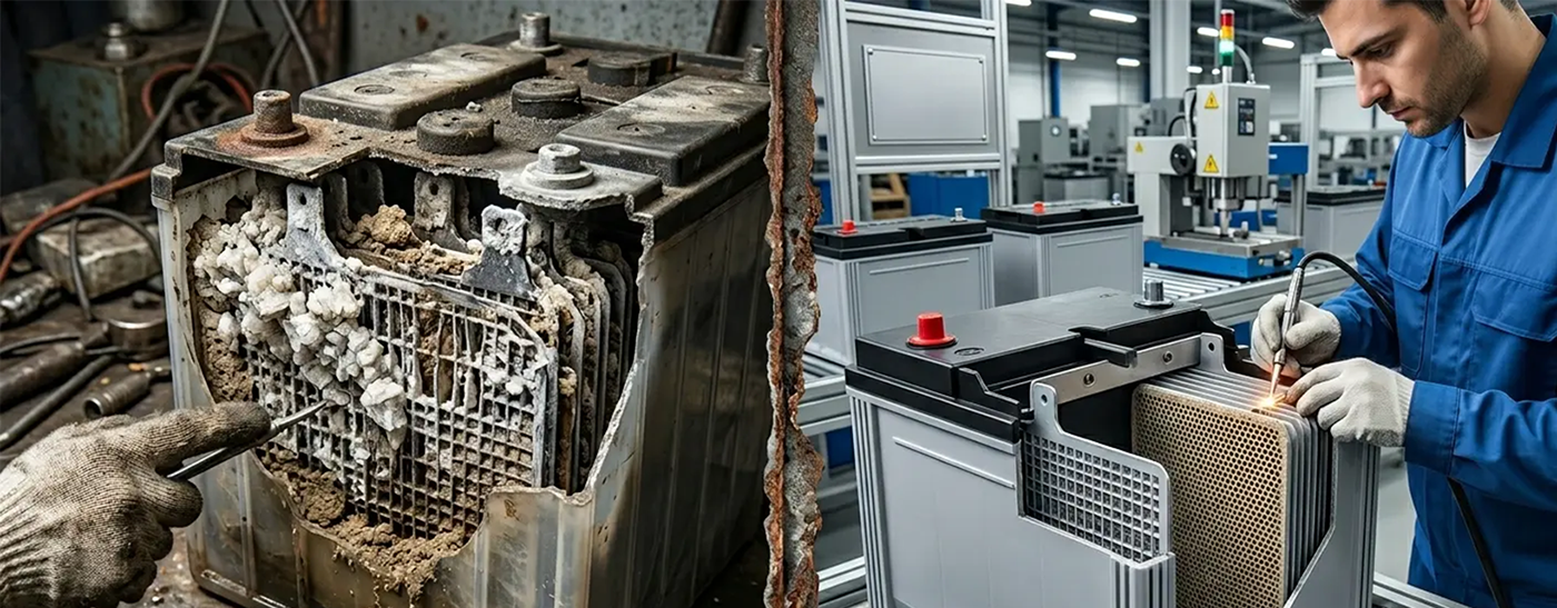 - Коррозия положительных решёток: Вызвана электрохимическим окислением металла, которое активизируется при повышенных напряжениях зарядки и высоких температурах. Со временем коррозия ослабляет структуру решёток, ухудшает проводимость и снижает механическую прочность, что в тяжёлых случаях приводит к деформации пластин и нарушению внутренней геометрии.