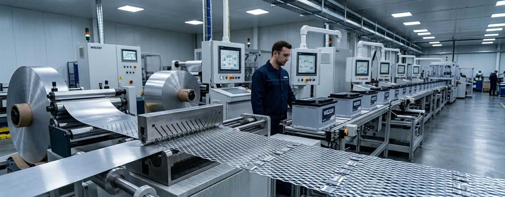 ExMET (Expanded Metal) — это инновационный метод производства электродных пластин, используемый в аккумуляторах Wezer, основанный на комплексном процессе расширения металлической ленты, включающем этапы прокатки, перфорации и механической растяжки. Этот технологический процесс позволяет получать электродные пластины с высокими механическими свойствами, однородной пористостью и повышенной электропроводностью, что способствует улучшению электрохимических характеристик аккумуляторов Wezer, особенно в условиях интенсивных циклов эксплуатации.